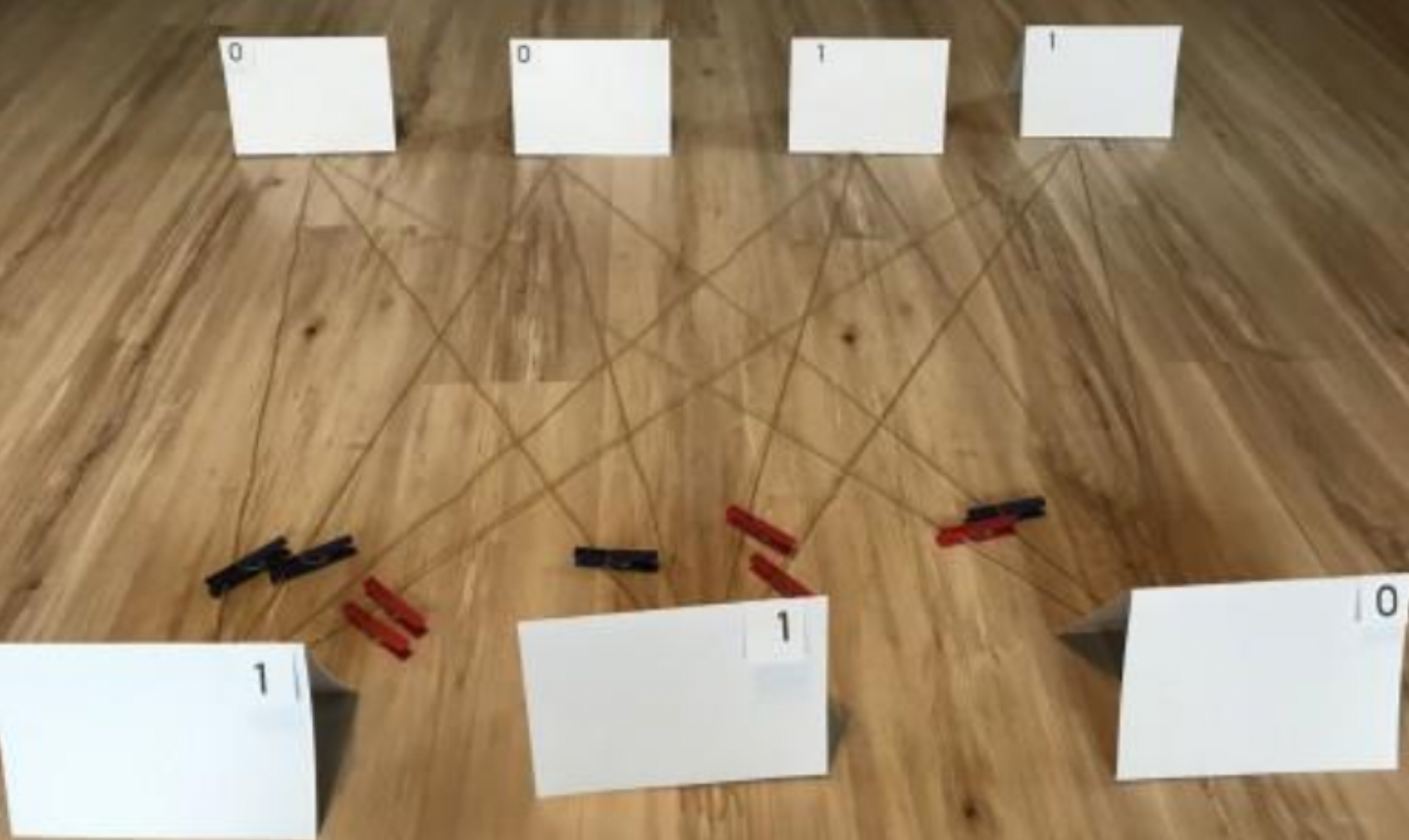 Zu Beginn wurden die Entwicklung und das Prinzip der Funktionsweise von KIs sowohl in Form einer Präsentation als auch in Form eines mitgebrachten Modells (ein sogenanntes Wollfadenperzeptron) erläutert. Das Modell gab den Lehrkräften die Gelegenheit, das Lernen einer KI spielerisch zu erfahren. Gleichzeitig lernten sie, wie es ebenfalls im Unterricht einsetzbar ist.