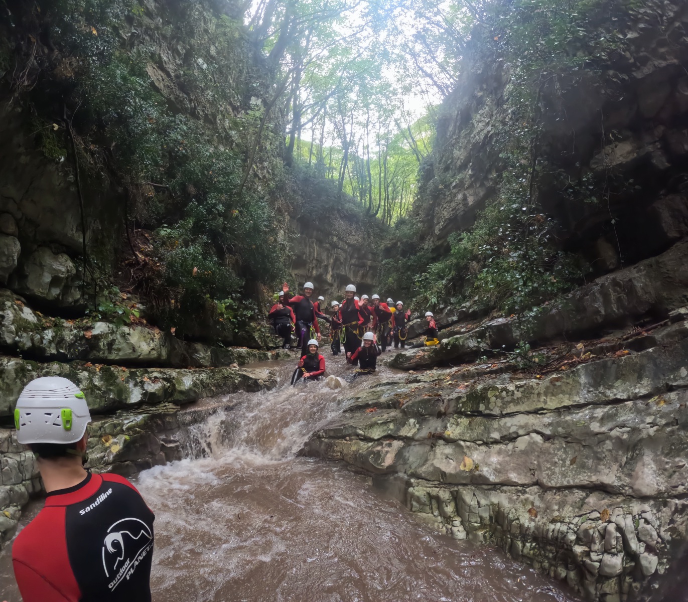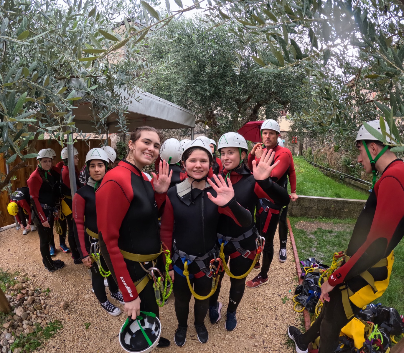 An unserem zweiten Tag entdeckten wir die Stadt Lazise, welche durch ihre Altstadt mit kleinen Gassen fast schon einen mittelalterlichen Charakter aufweist. Lazise hat außerdem einen sehenswerten Hafen und Teile der alten Stadtmauer machen das italienische Flair perfekt. Weiter ging es dann für uns zu einem nahegelegenen Canyon, wo wir von professionellen Guides durch spektakuläre Schluchten geführt wurden. Auch wenn wir durch den strömenden Regen bereits nach dem Umziehen völlig durchnässt waren, hatten die meisten von uns eine Menge Spaß: Abseilen an Wasserfällen, durch hohe Wasserbecken waten, rutschige Passagen überqueren oder mutige Sprünge von Felsen – das sogenannte Canyoning, ursprünglich eine französische Sportart, begeisterte uns und zeigte uns erneut, wie faszinierend Natursport sein kann. Nach diesem ereignisreichen Tag hieß es eigentlich nur noch: Essen und ab ins Bett. Naja, fast, denn das abendliche Singen mit Herrn Kromars und Herrn Schroths Gitarren, sowie Herrn Heidts liebliche Stimme (und unserem neuen bayrischen Freund M.) durfte natürlich nicht fehlen. Wir saßen beieinander, stimmten ein Lied nach dem anderen an, und vielleicht hätte man meinen können, der Campingplatz habe die wohl beste Band Europas gebucht…