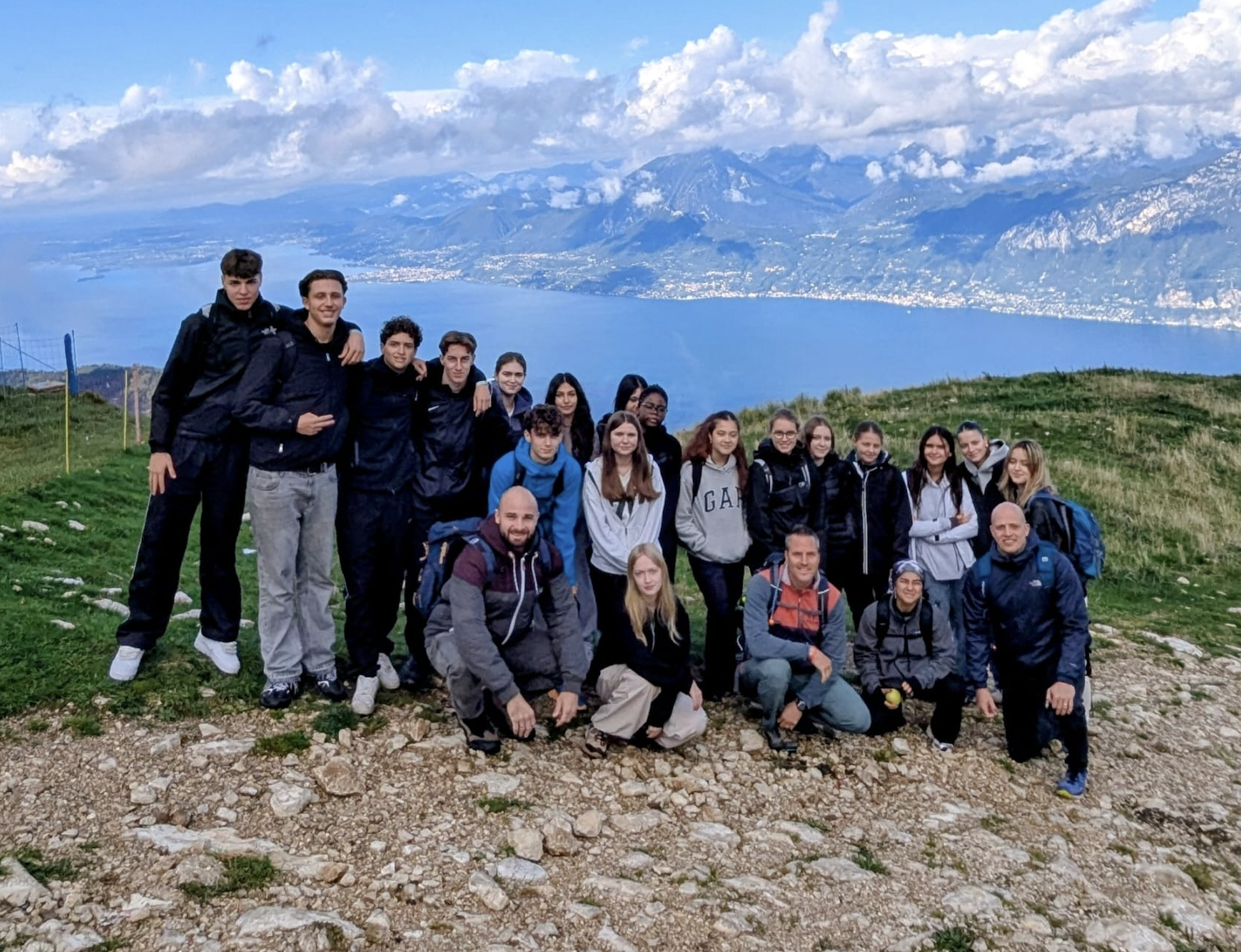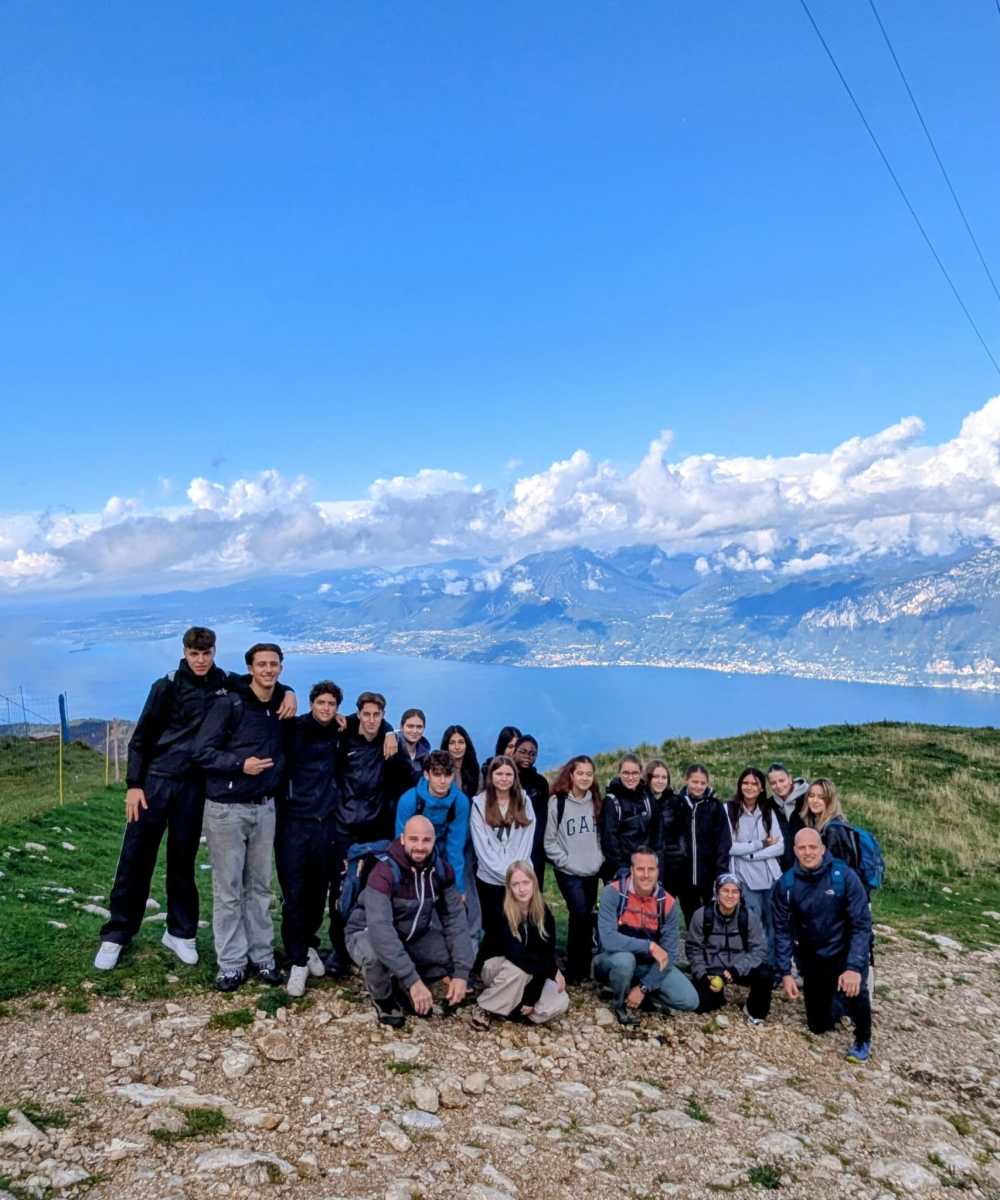 Am nächsten Morgen starteten wir früh zu unserer Wandertour in das beeindruckende Bergmassiv des Monte Baldo. Nachdem wir – zur Freude der meisten Schüler*innen – den ersten Anstieg in einem Korblift überbrückten, ging es erst richtig los: Schritt für Schritt kämpften wir uns (EGAL ob in Chucks, Sneakern oder kaputten Wanderschuhen) den Berg hinauf, auch wenn die Aussicht oft nur aus dichtem Nebel bestand. Nach einer kurzen Stärkung auf der Berghütte und einem ordentlichen Regenguss/Hagelschauer liefen wir, anders als geplant, die gleiche Route zurück. Langweilig war das jedoch keineswegs, denn der Himmel klarte auf und gab zumindest für kurze Zeit eine atemberaubende Aussicht auf den gesamten Gardasee frei. Spätestens jetzt war jeder Schritt auf den alten Wegen des 1. Weltkriegs lohnenswert. Die Pfade, auf denen wir liefen, waren zwischen 1914 und 1918 Lebens- und Leidensraum für tausende Soldaten, die, anders als wir, nicht die Aussicht genießen konnten, sondern für Österreich oder Italien kämpfen mussten. Das Donnergrollen des herannahenden Gewitters und der Nebel verstärkten die mystische Stimmung während Herr Schroths Geschichts-Exkurs. Nach rund sechs Stunden kamen wir erschöpft, aber glücklich – und nach zwei weiteren Lift-Fahrten – wieder im Tal an. Auf der Rückfahrt herrschte Stille im Bus, denn den Schlaf hatte sich jeder redlich verdient.