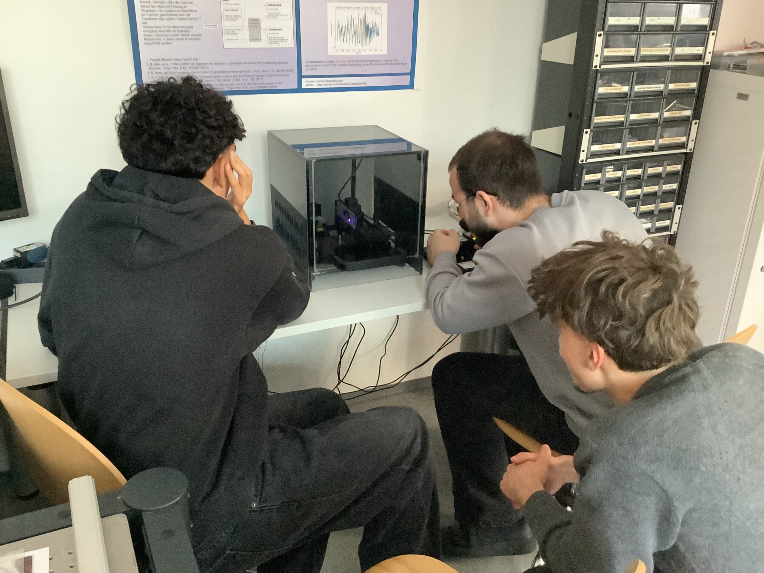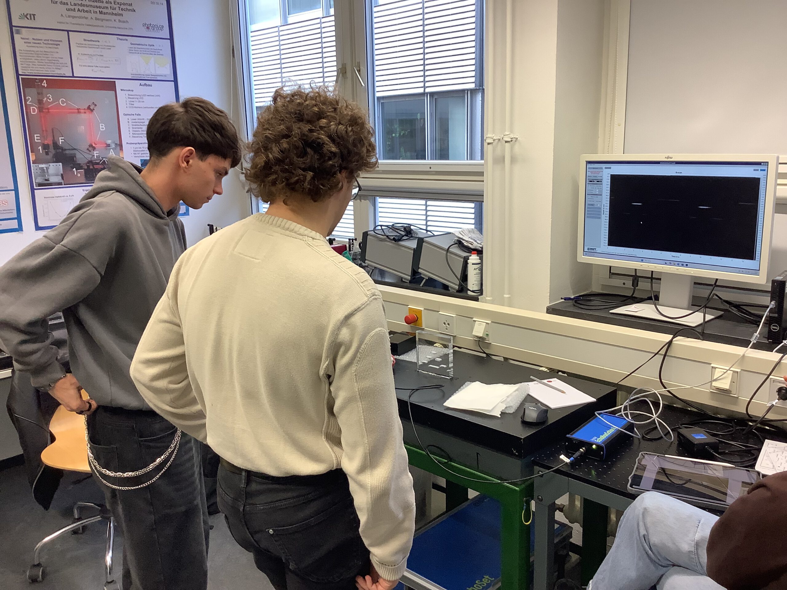 Während die Mittel an der Schule stark begrenzt sind, bietet das KIT eine Ausstattung, die weit über die der Schule hinaus geht. Das Thema des Praktikums wechselt in regelmäßigen Abständen. Dieses Mal gab es die Möglichkeit, unterschiedliche Versuche zum Thema Medizinphysik durchzuführen. In allen Versuchen wurden zunächst die physikalischen Grundlagen besprochen, damit die Schüler*innen ausreichend auf den Versuch vorbereitet waren. Trotz des Termins am späten Nachmittag war die Beteiligung und Begeisterung der Schüler*innen groß.