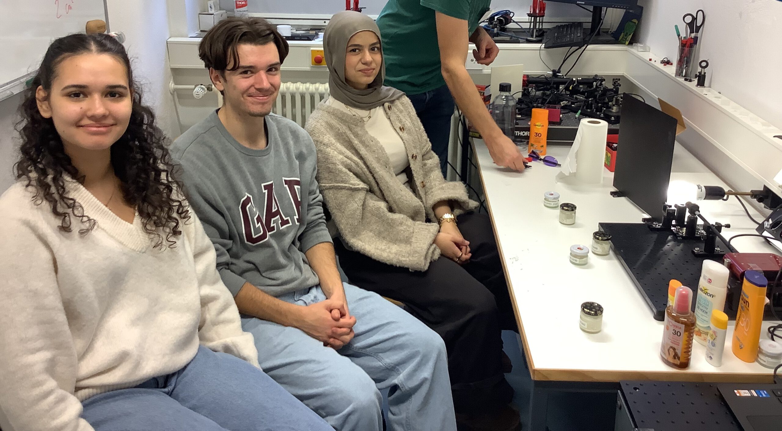 Im letzten Versuch ging es darum, das Lichtspektrum einer Lampe zu analysieren und anschließend zu untersuchen, wie gut verschiedene Sonnencremes und andere Pflegeprodukte unterschiedliche Wellenlängenbereiche des Lichts absorbieren.