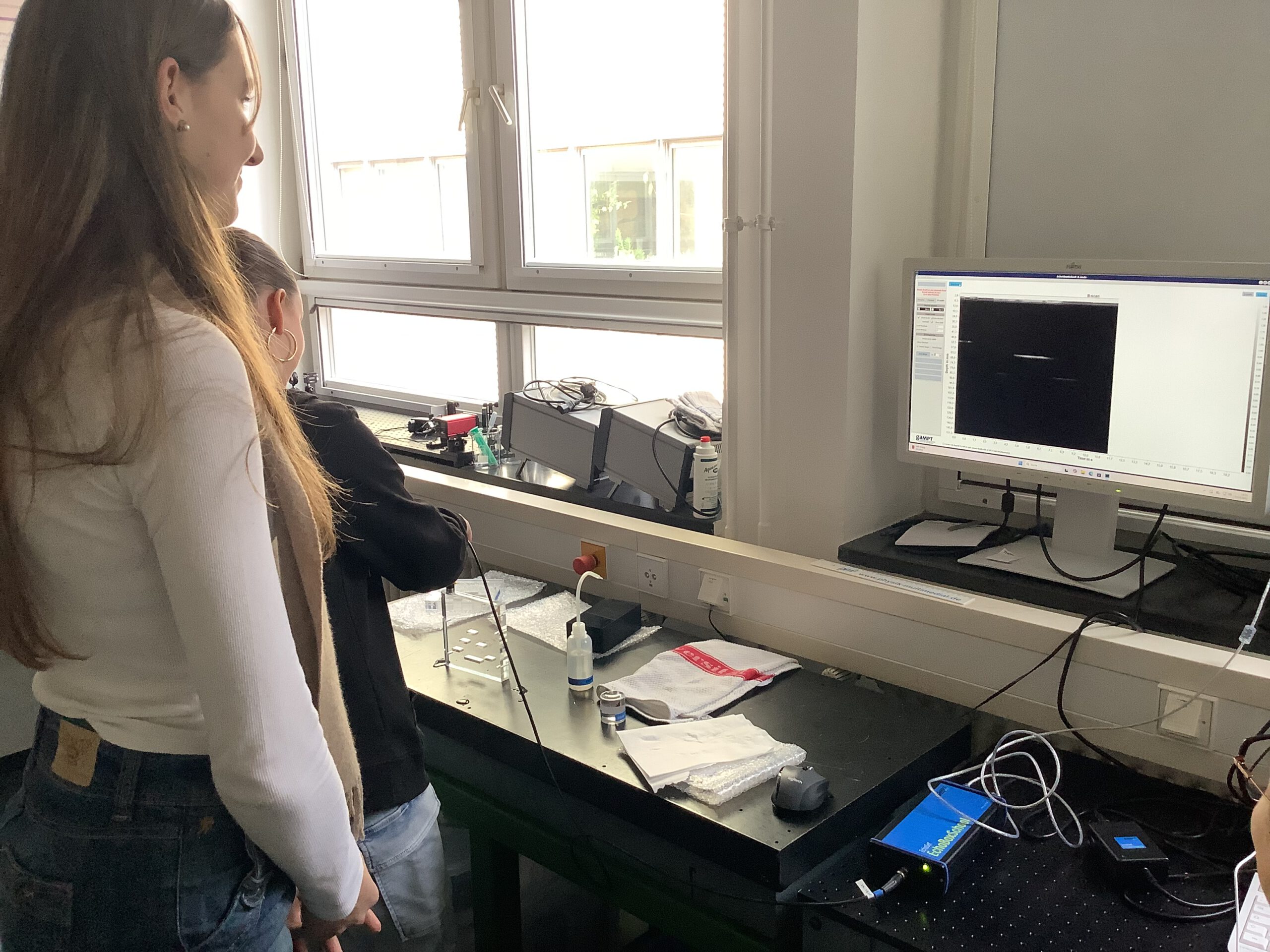 Ein Versuch demonstrierte die Funktionsweise einer Ultraschalluntersuchung. Hier wurde mit einem Ultraschallkopf zunächst an bekannten Strukturen geübt, um aus dem reflektierten Signal Eindringtiefe und Mehrfachreflexionen unterscheiden zu können. Zum Abschluss wurde ein unbekannter Körper untersucht und versucht, die innere Struktur mithilfe der Ultraschalluntersuchung herauszufinden.