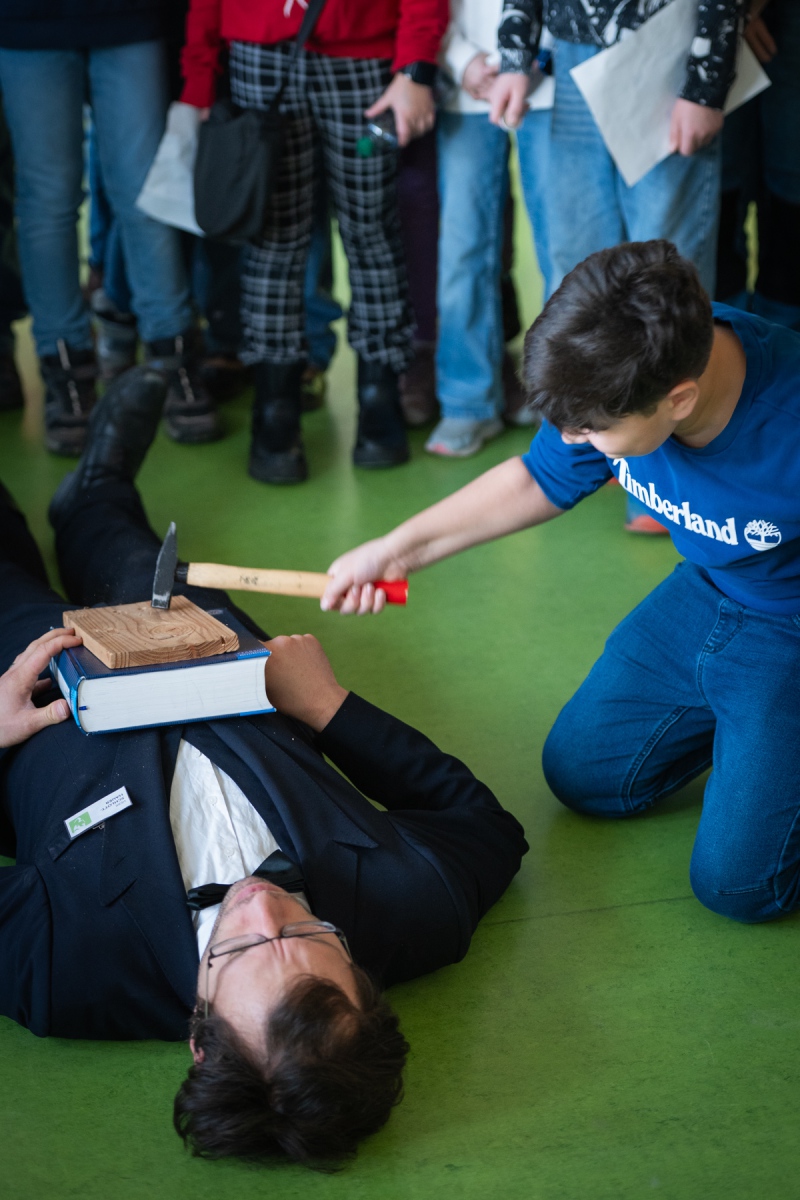 Ein besonderes Highlight war auch die Physikshow, bei der nicht nur gestaunt, sondern auch geschmunzelt wurde: Mit Riesen-Schokoküssen, einem „Schlag den Lehrer“ und eindrucksvollen Experimenten bewiesen die Physiklehrer, dass Naturwissenschaften alles andere als trocken sind. Großes Theater für die Kleinen bot die English Theatre AG mit einer modernen Version von Schneewittchen. Poisoned apple? So yesterday!