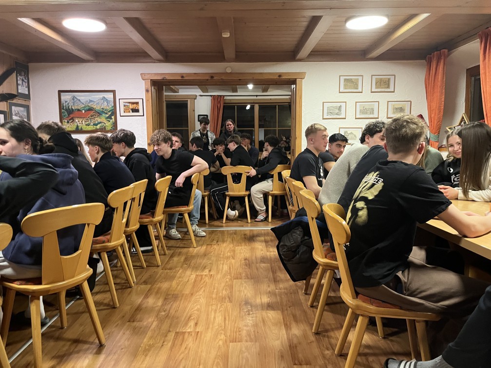 Was wäre ein Schullandheim ohne die Abende? Egal ob beim gemeinsamen Schauen des DFB-Pokals, bei hitzigen Spieleabenden oder der legendären Karaoke-Runde, die Abendprogramme waren der perfekte Abschluss für die anstrengenden Tage. Belohnt wurden wir am Freitag mit echtem Kaiserwetter, strahlender Sonnenschein und ein grandioser Ausblick rundeten die Fahrt ab, bevor uns der Bus am Nachmittag wieder sicher zurück nach Pforzheim brachte. Fazit: Wir kehren nicht nur mit Muskelkater zurück, sondern mit neuen Freundschaften, neuen Skills in der Küche und auf der Piste sowie jeder Menge schöner Erfahrungen.